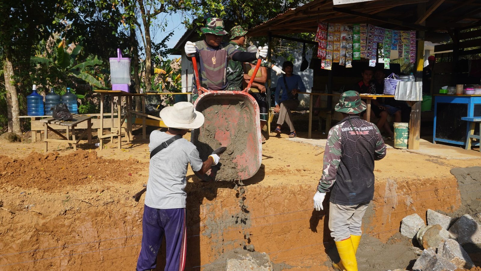 Kotawaringin Timur – Alat dorong satu roda atau arco menjadi sarana penting yang digunakan anggota Satgas TNI Manunggal Membangun Desa (TMMD) ke-127 Kodim 1015/Sampit dalam pengerjaan pembangunan siring badan jalan di Desa Tribuana, Kecamatan Telaga Antang, Kabupaten Kotawaringin Timur, Kamis (12/02/2026).