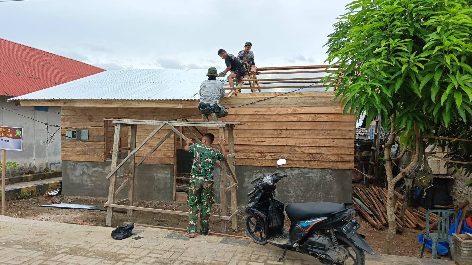 Pemasangan atap seng dilakukan secara gotong royong antara prajurit dan masyarakat setempat. Kekompakan ini mempercepat proses sekaligus mempererat kebersamaan di lapangan.