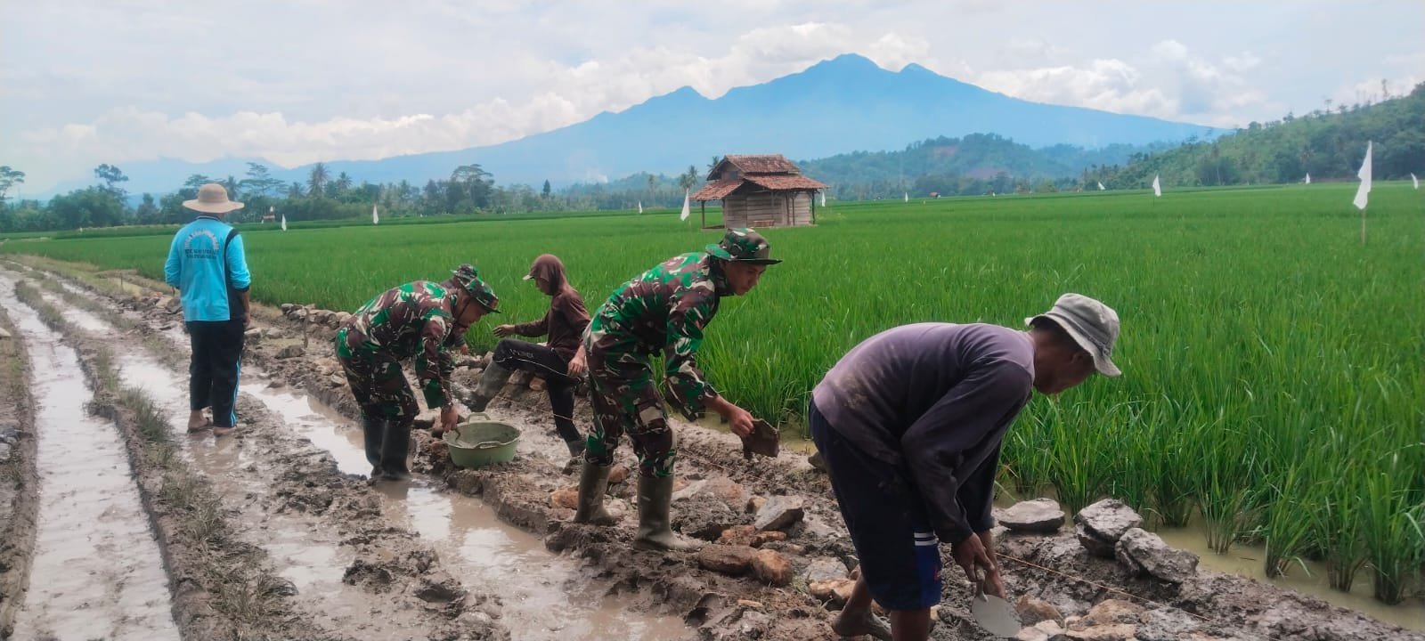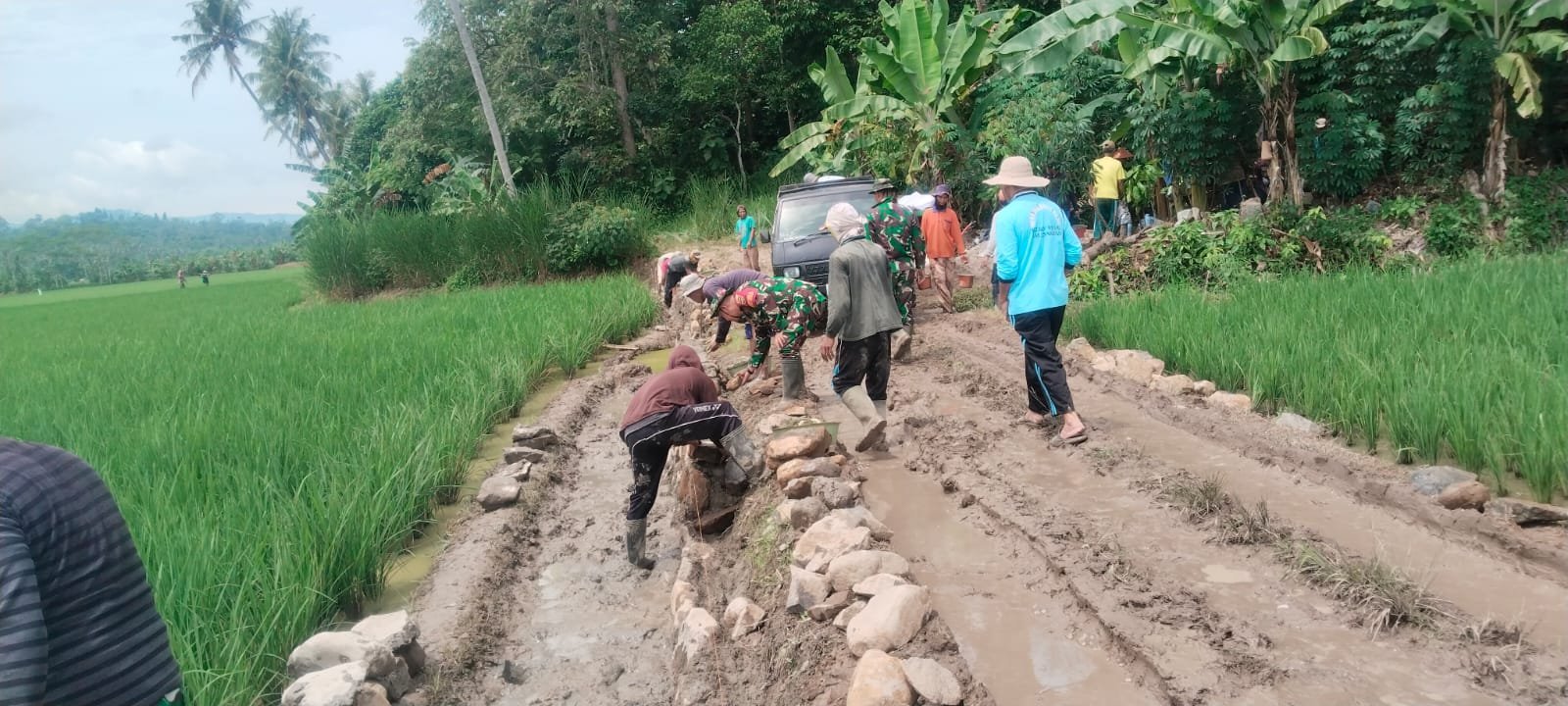 Suasana kerja di lokasi pembangunan dipenuhi semangat kebersamaan. Meski harus menempuh jalur yang cukup berat, personel Satgas TMMD dan warga tetap bekerja dengan penuh semangat sambil saling menyemangati satu sama lain.