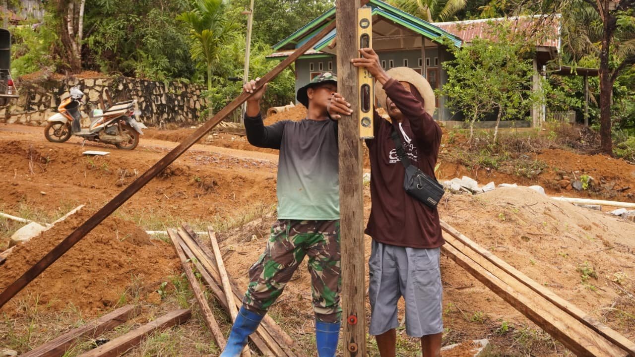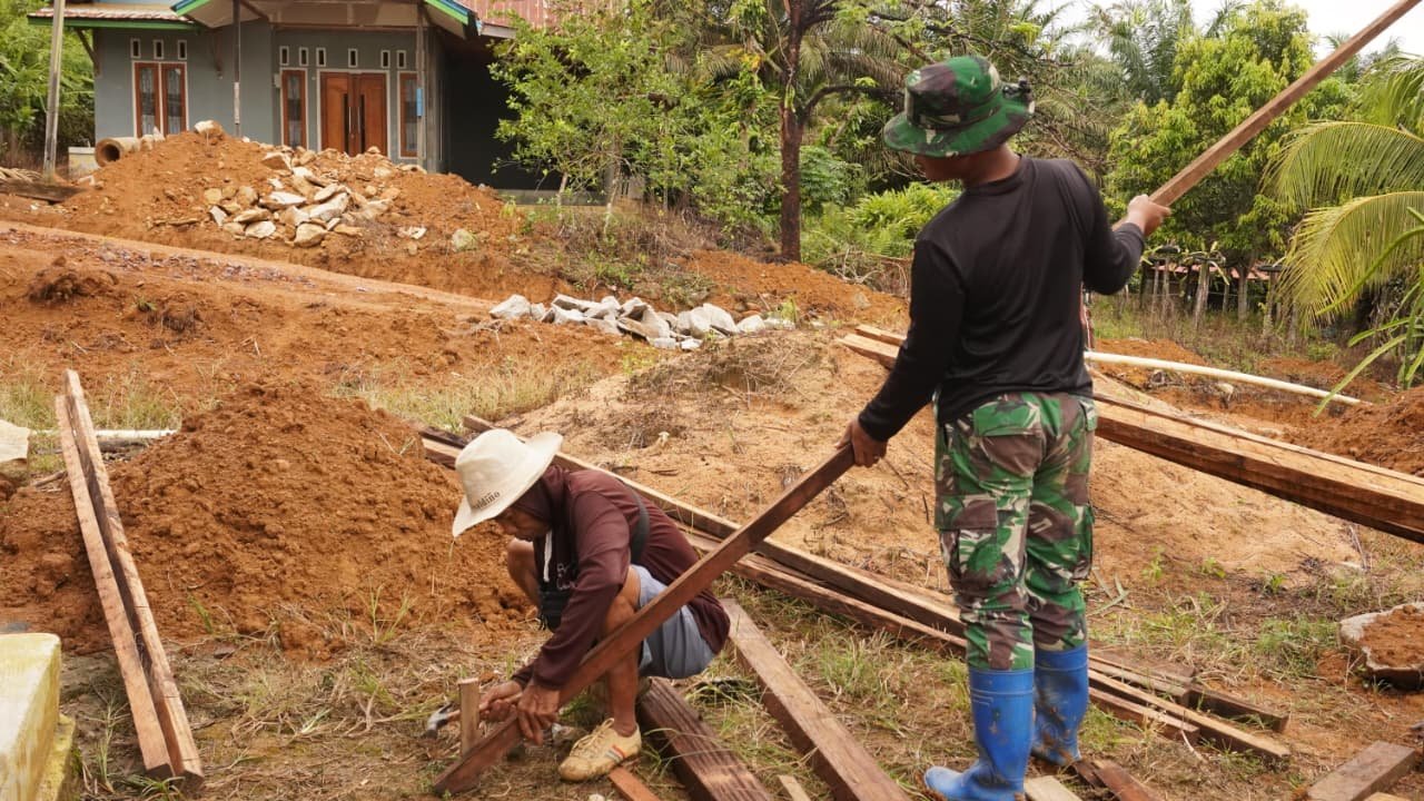 Personel Satgas TMMD bersama warga setempat terlihat bekerja sama dalam proses pengerjaan drainase. Kolaborasi tersebut mempercepat proses pembangunan sekaligus memperkuat semangat gotong royong di tengah masyarakat.