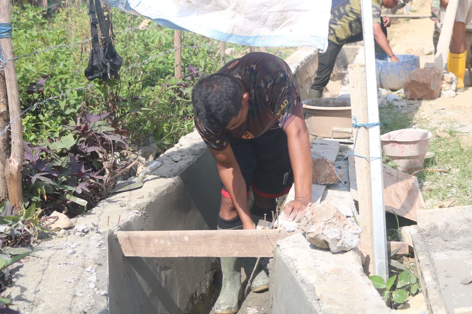 Melalui pekerjaan plasteran yang sedang dilakukan, struktur saluran air diperkuat agar dapat mengalirkan air dengan lebih lancar dan mencegah terjadinya genangan saat musim hujan.