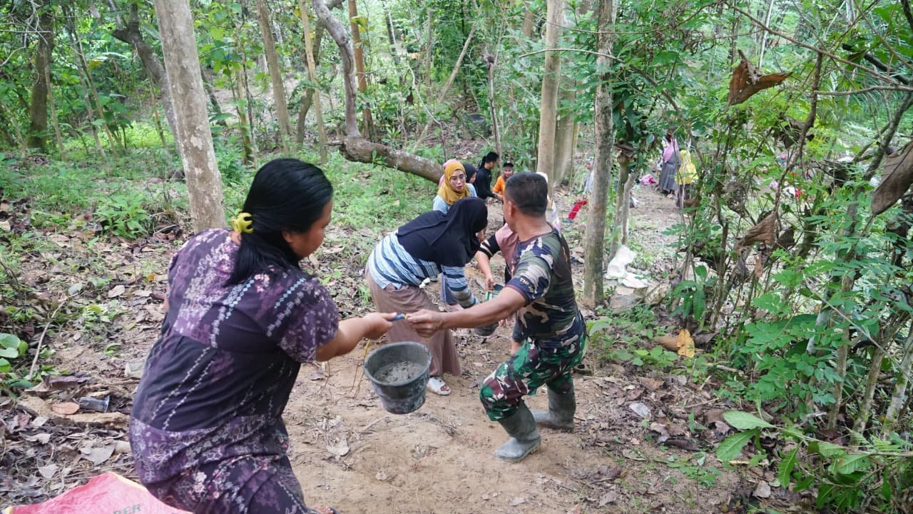 Kegiatan pembangunan bak penampungan air dilakukan dengan penuh semangat meskipun harus menghadapi kondisi cuaca panas serta jalur pengangkutan material yang cukup berat. Personel Satgas dan warga terlihat saling membantu membawa semen serta perlengkapan pembangunan lainnya.