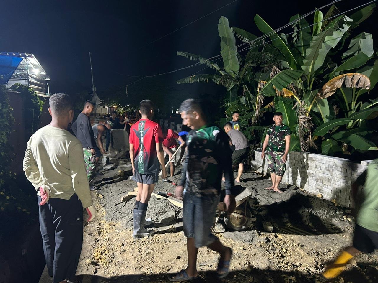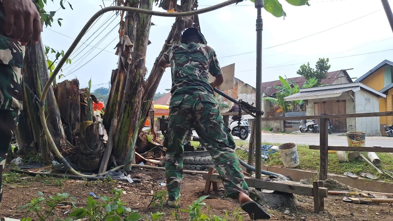 Personel Satgas bersama warga bahu-membahu menjalankan alat bor dan menyiapkan sarana pendukung, menunjukkan kuatnya sinergi antara TNI dan masyarakat.