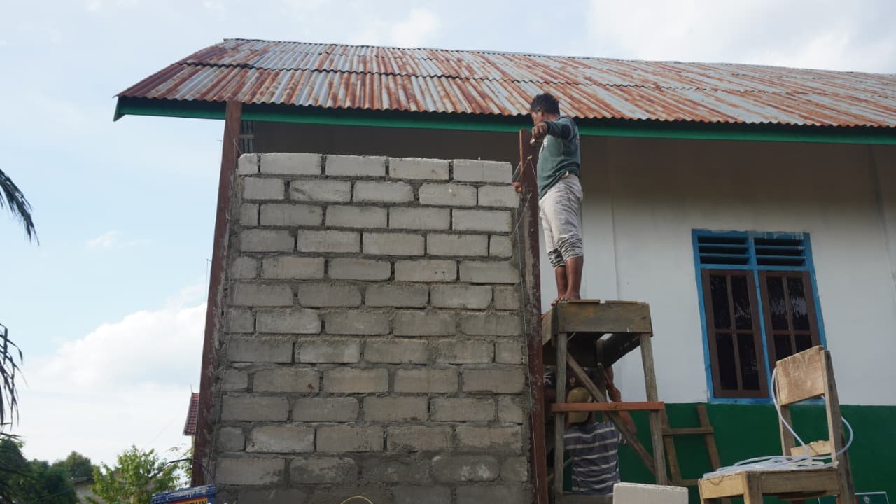 Tak hanya personel TNI, warga sekitar turut ambil bagian membantu proses pembangunan. Tangga kayu yang digunakan prajurit juga dimanfaatkan bersama saat mengerjakan bagian dinding dan pengecatan bangunan.