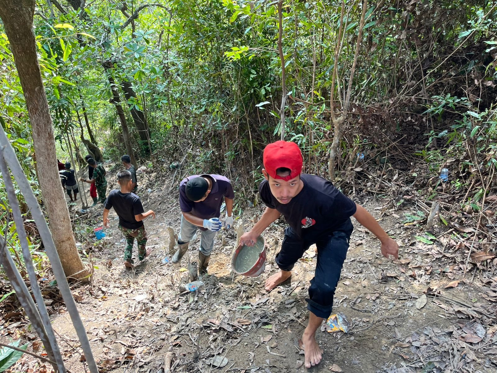 Sinergi kuat tampak saat prajurit dan warga membentuk barisan untuk melangsir material secara manual melewati jalur pendakian. Setiap sak semen dan ember adukan dioper secara estafet demi mempercepat pekerjaan.