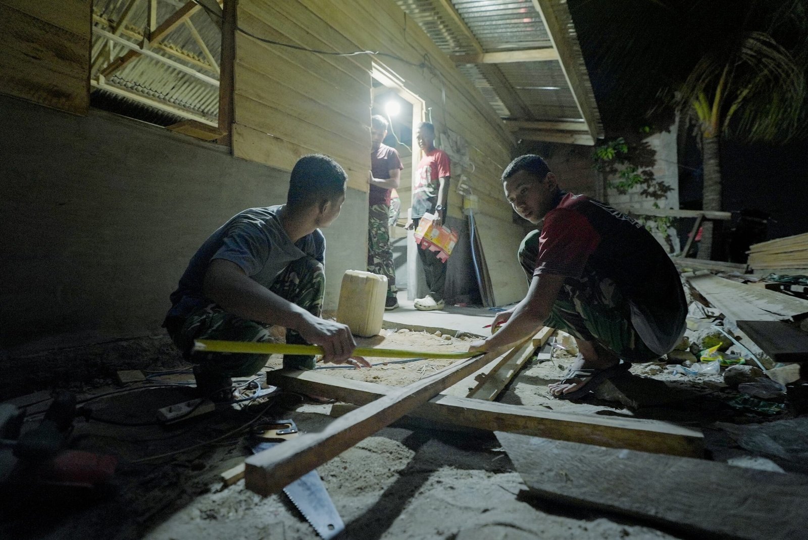 Personel Satgas bersama warga tampak bekerja sama menyelesaikan berbagai detail pekerjaan pembangunan rumah, termasuk pemasangan plafon pada hunian yang sedang direhabilitasi.