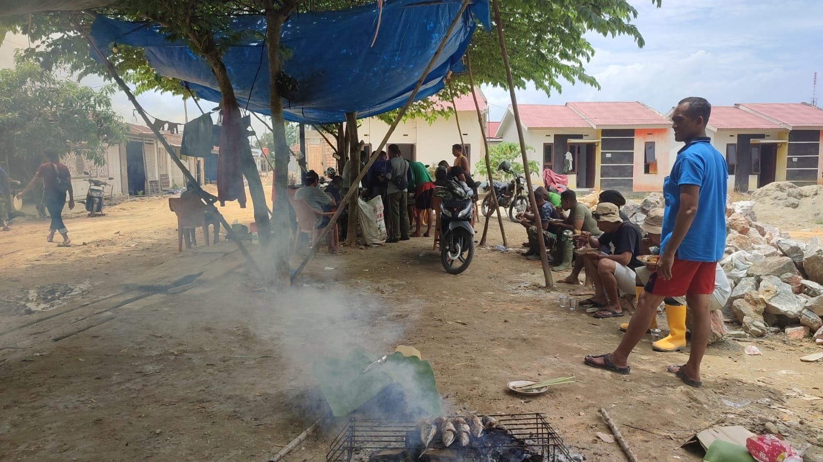 Personel TNI dan warga tampak menikmati hidangan secara sederhana dengan penuh keakraban. Canda dan obrolan ringan menghiasi suasana, mencerminkan hubungan yang harmonis antara aparat dan masyarakat setempat.