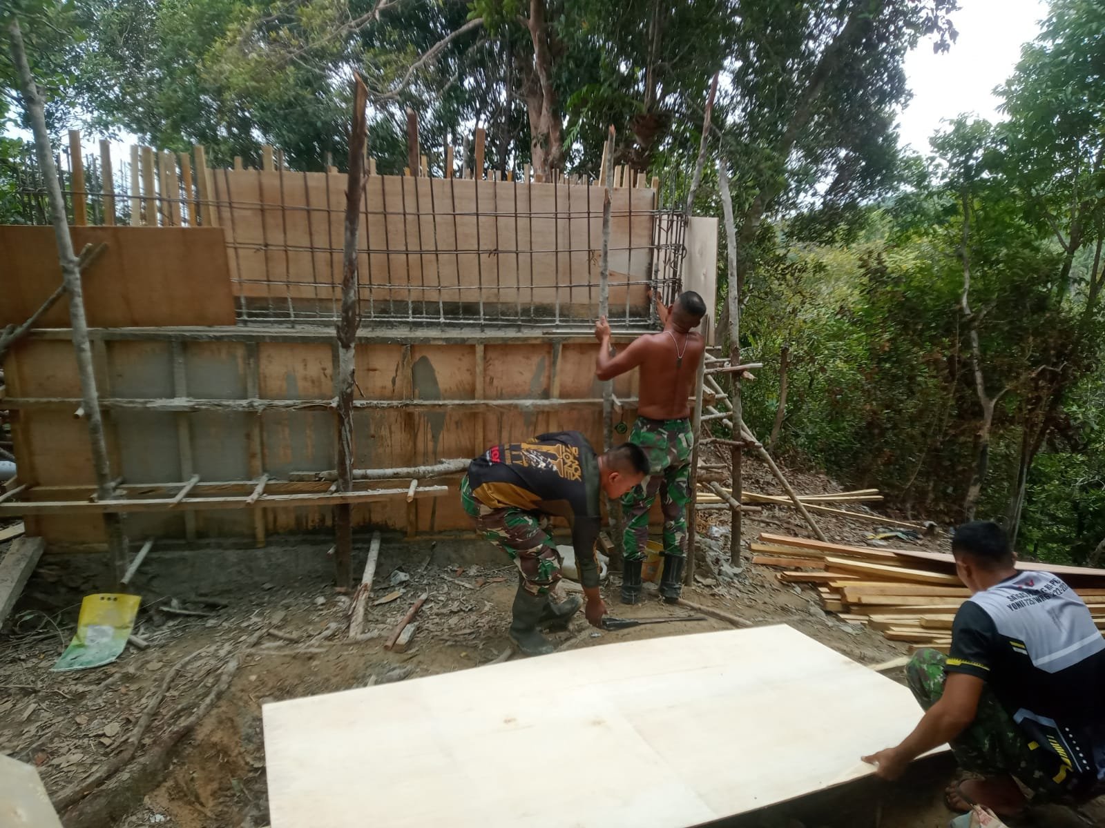 Tahap awal pengerjaan difokuskan pada pemasangan mal atau cetakan dari papan kayu sebelum proses pengecoran beton dilaksanakan. Personel Satgas bersama warga bahu-membahu menyelesaikan pekerjaan tersebut dengan penuh semangat.