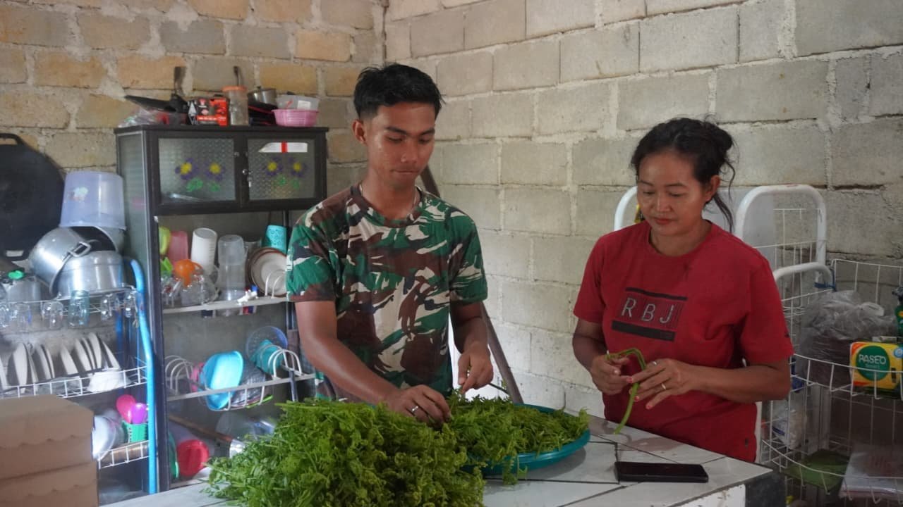 Anggota Satgas TMMD pun tidak canggung, seperti yang dilakukan Pratu Suryadi, ia ikut membantu lbu Eni tuan rumah yang sedang memasak sayur bayam atau menggoreng ikan sebagai lauk makan siang. Suasana keakraban pun nampak jelas, serasa seperti keluarga.