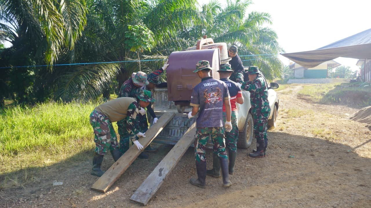 Kotawaringin Timur – Kekompakan antara anggota Satgas TMMD Reguler ke-127 Kodim 1015/Sampit bersama warga kembali terlihat saat memindahkan mesin molen guna mendukung pembangunan siring badan jalan, Jumat (13/02/2026).