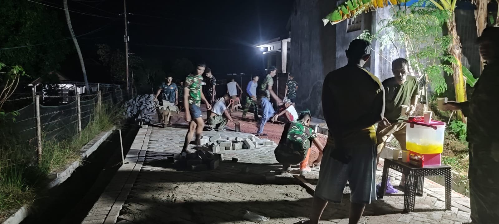 Kolaborasi yang solid tampak ketika prajurit dan warga saling bergantian mengangkut serta menyusun material paving dengan penuh semangat meski kondisi malam hari.