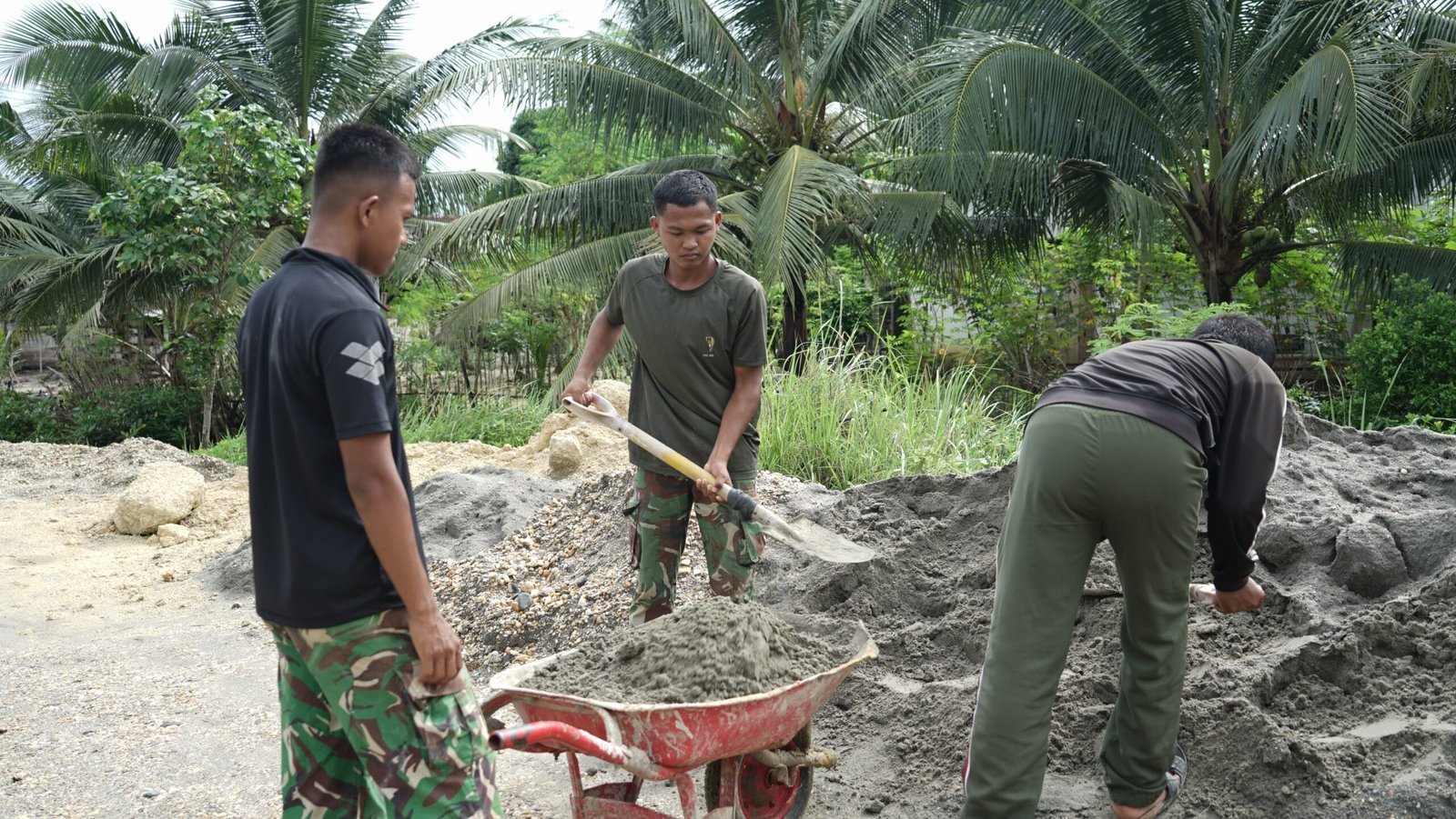 Tanpa raut lelah yang berarti, mereka tetap bahu-membahu memindahkan material demi mempercepat pembangunan infrastruktur yang dinanti warga.