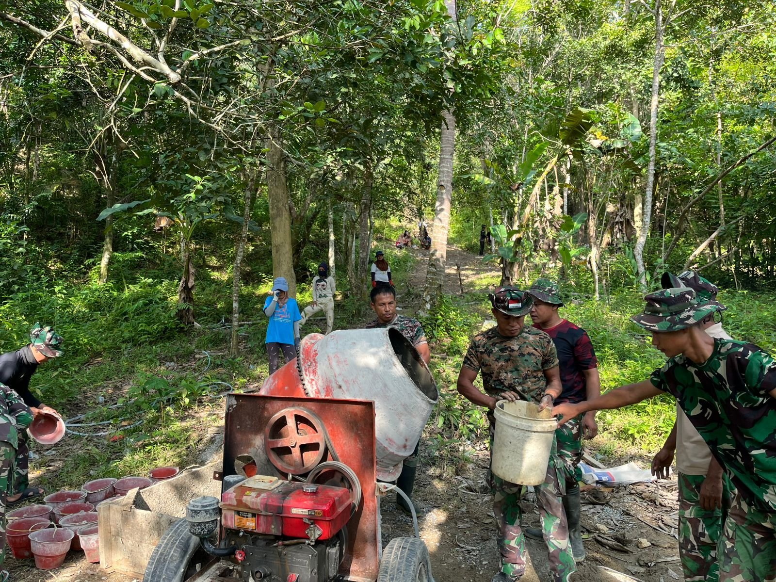 Meski cuaca di lapangan cukup menantang, para personel Satgas bersama warga tetap menunjukkan semangat tinggi dalam mengoperasikan peralatan dan menyusun material konstruksi.
