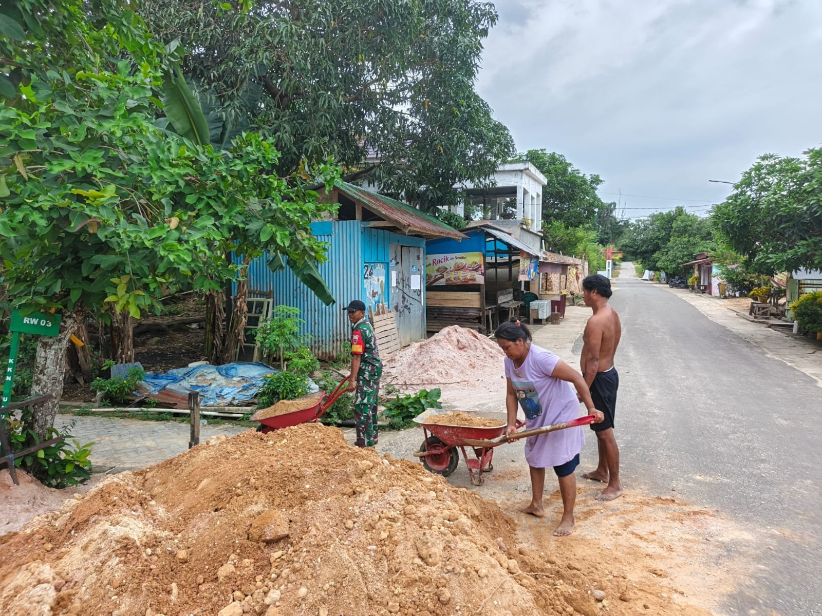 Di tengah aktivitas prajurit, sepasang suami istri setempat secara sukarela turun tangan membantu melansir material timbunan menggunakan gerobak dorong.