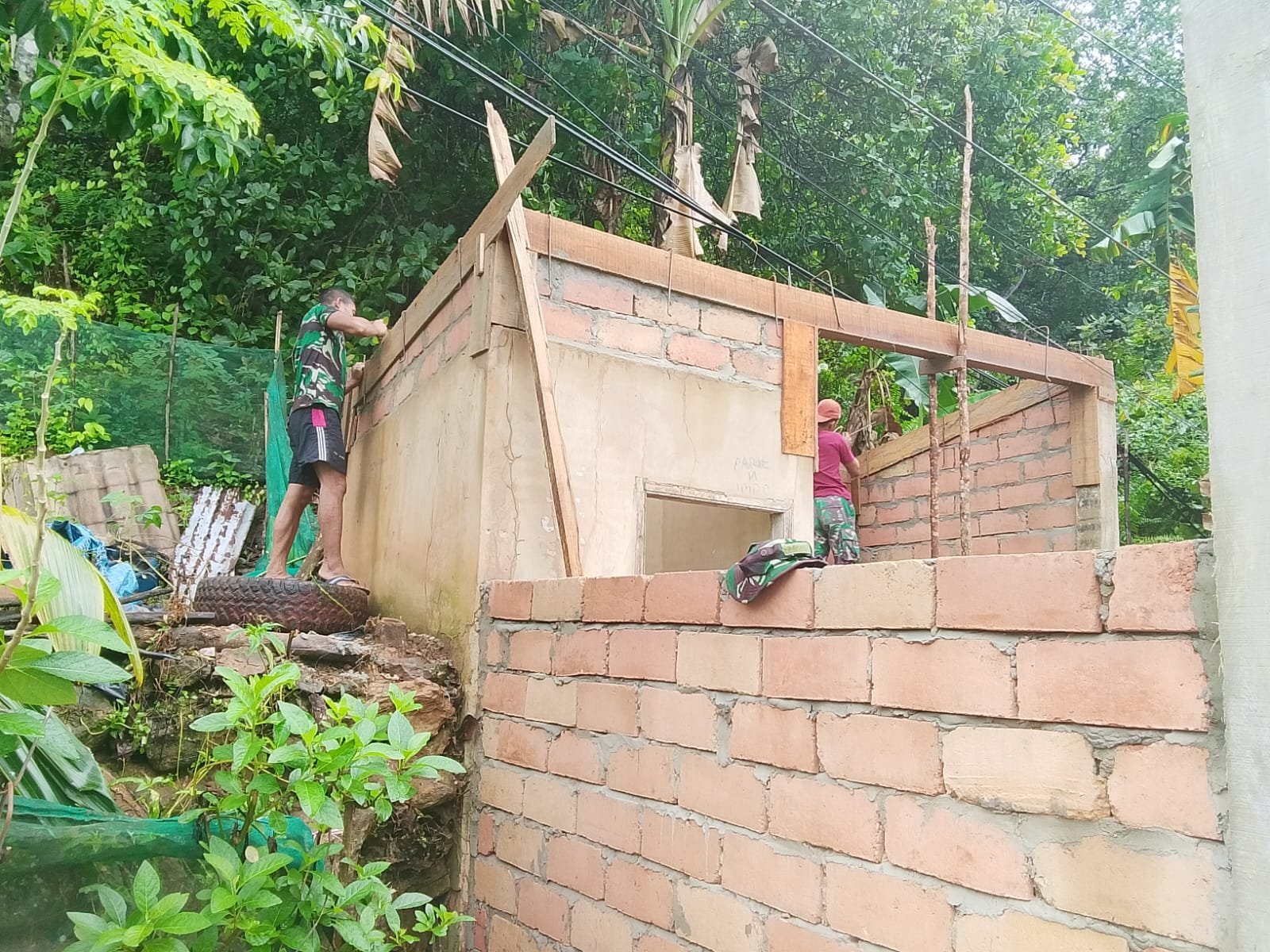 Satgas dari Kodim 1417/Kendari memusatkan perhatian pada pengecoran slop atas guna memperkuat struktur bangunan MCK agar lebih kokoh dan tahan lama.
