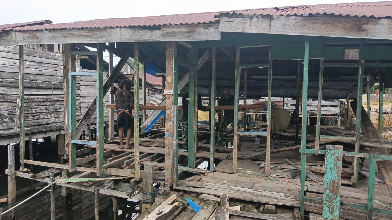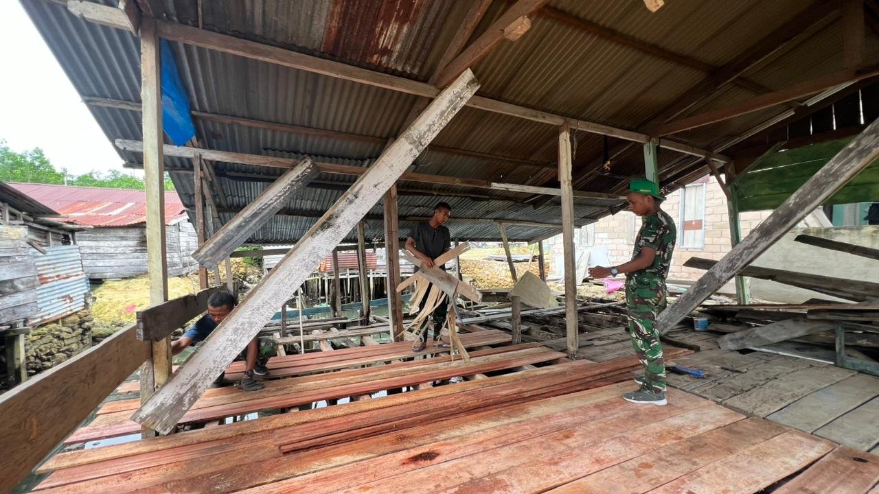 Personel Satgas terlihat bahu-membahu bersama masyarakat memperbaiki bagian-bagian rumah yang mengalami kerusakan, mulai dari struktur dinding hingga atap bangunan.