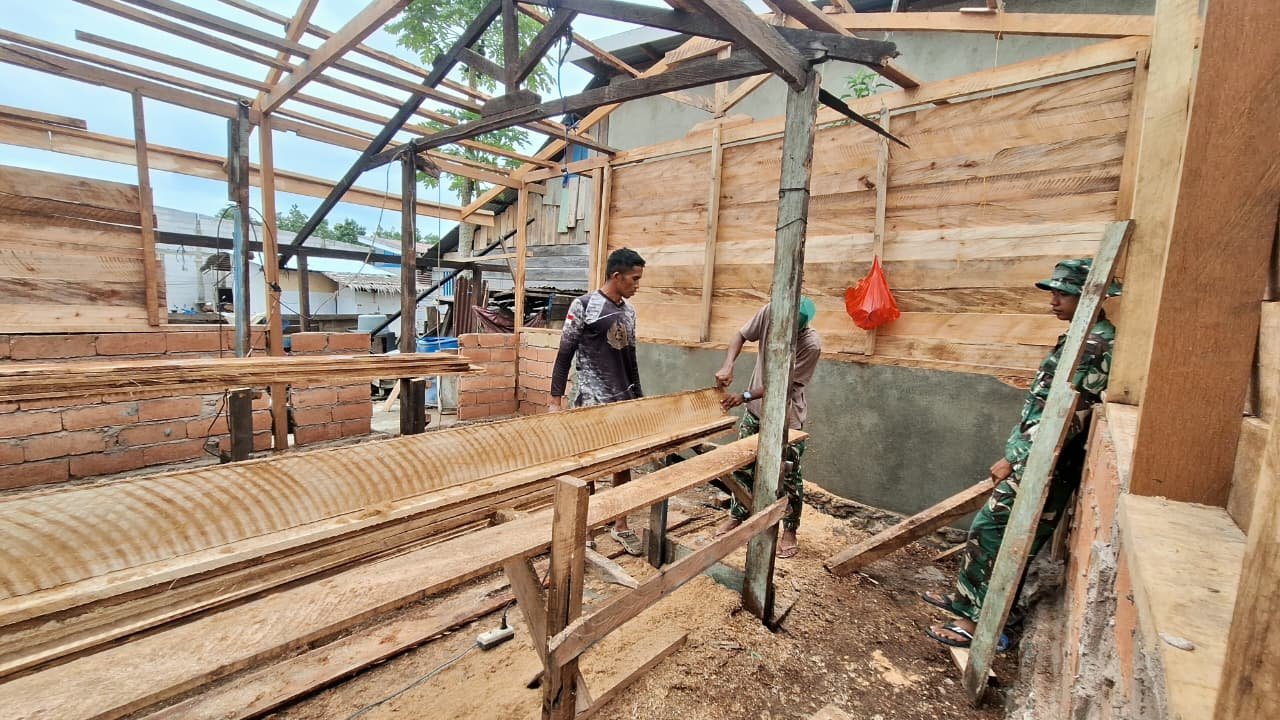 Tahap pemasangan dinding kayu sebagai bagian utama struktur bangunan hampir sepenuhnya selesai. Perubahan signifikan tampak jelas, dari kondisi rumah yang sebelumnya kurang layak kini menjelma menjadi hunian yang lebih kokoh dan aman.