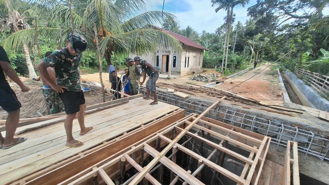 Pada tahap terkini, prajurit TNI bersama warga setempat terlihat fokus melakukan perakitan rangka besi sebagai tulangan utama struktur jembatan. Proses ini menjadi bagian krusial sebelum memasuki tahapan pengecoran lantai.