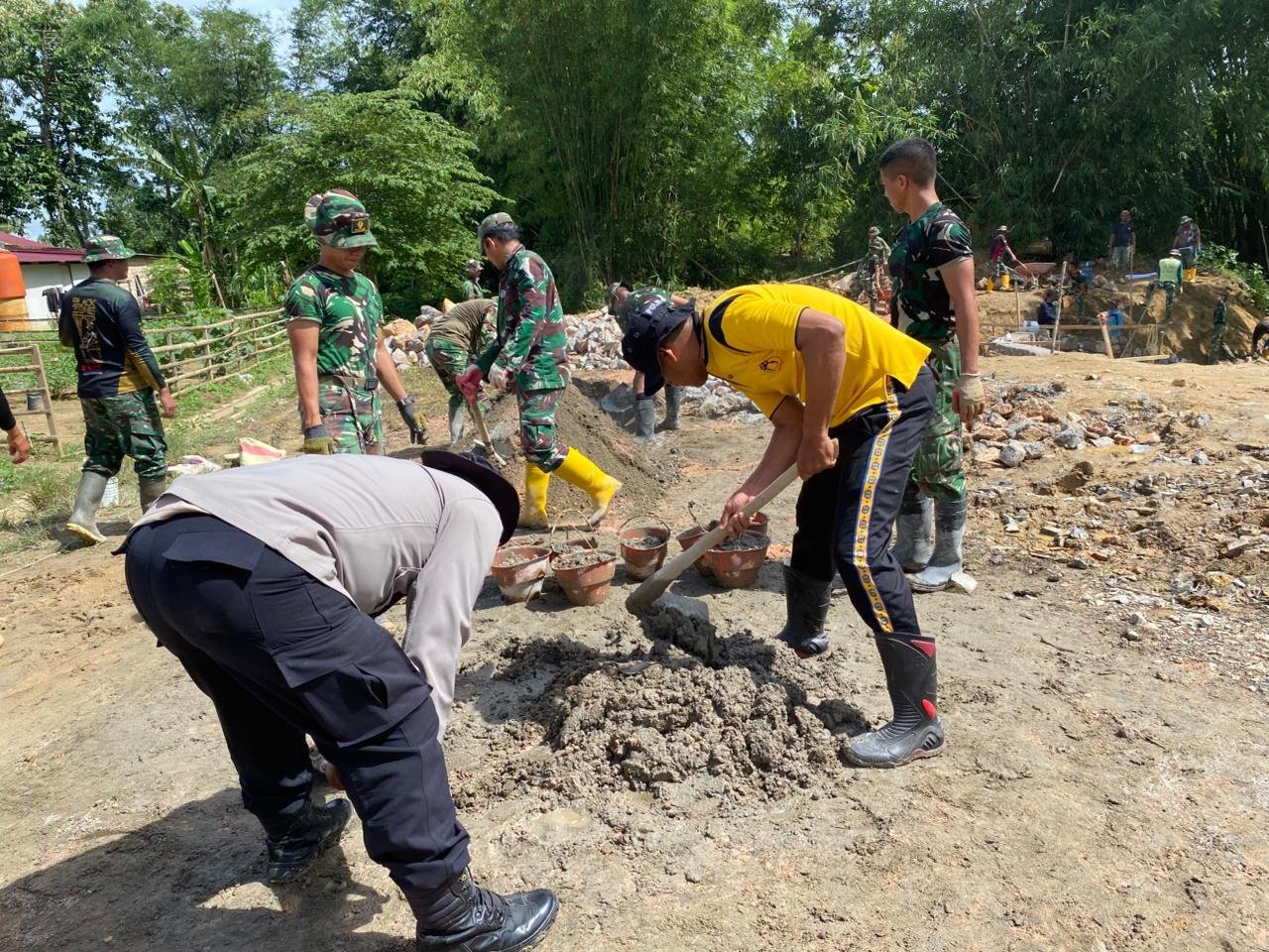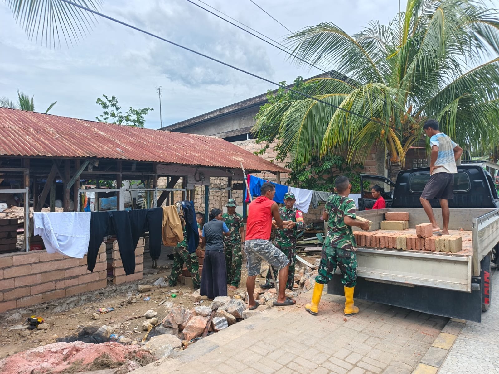 Personel Satgas bersama masyarakat setempat tampak bahu-membahu menyelesaikan setiap proses pekerjaan, mulai dari perbaikan struktur bangunan hingga tahap finishing.