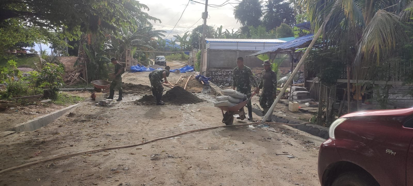 Sejumlah prajurit bersama warga setempat tampak kompak melangsir material semen dan pasir secara manual untuk mendukung proses plesteran dinding talud. Kegiatan ini dilakukan guna memastikan struktur bangunan memiliki daya tahan maksimal terhadap tekanan tanah dan cuaca.