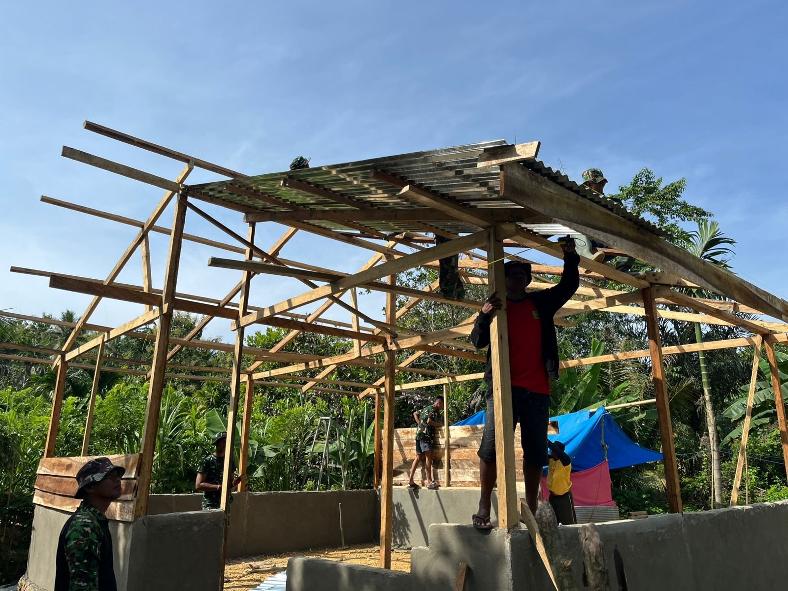 Para prajurit TNI bersama masyarakat tampak bekerja sama mengangkat dan memasang material bangunan agar konstruksi rumah dapat segera terbentuk.
