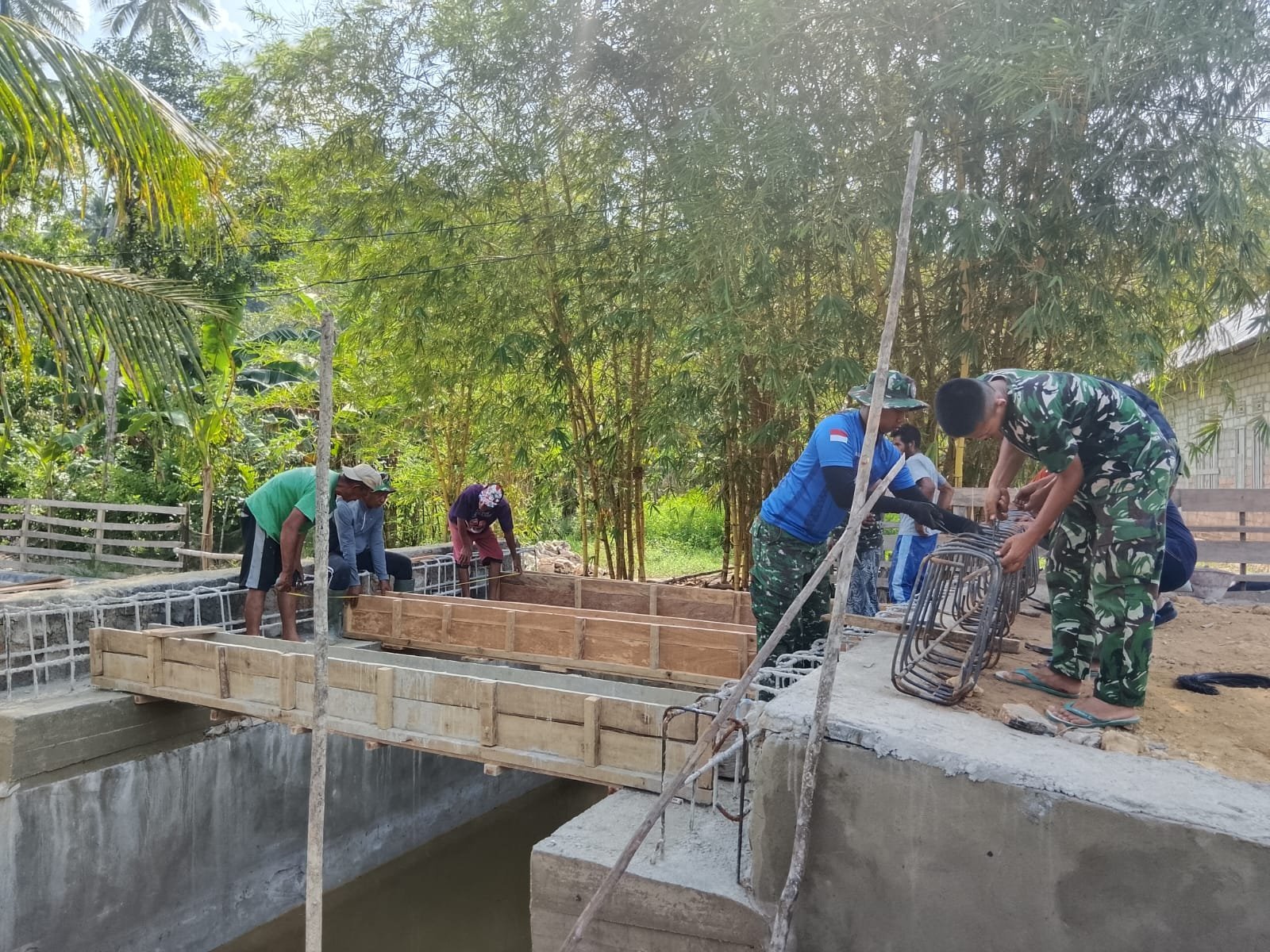 Tahapan pengecoran ini menjadi bagian krusial dalam pembangunan jembatan guna memastikan konstruksi kokoh dan tahan lama. Personel TNI bersama warga bekerja dengan penuh ketelitian agar struktur yang dibangun mampu menunjang aktivitas masyarakat dalam jangka panjang.