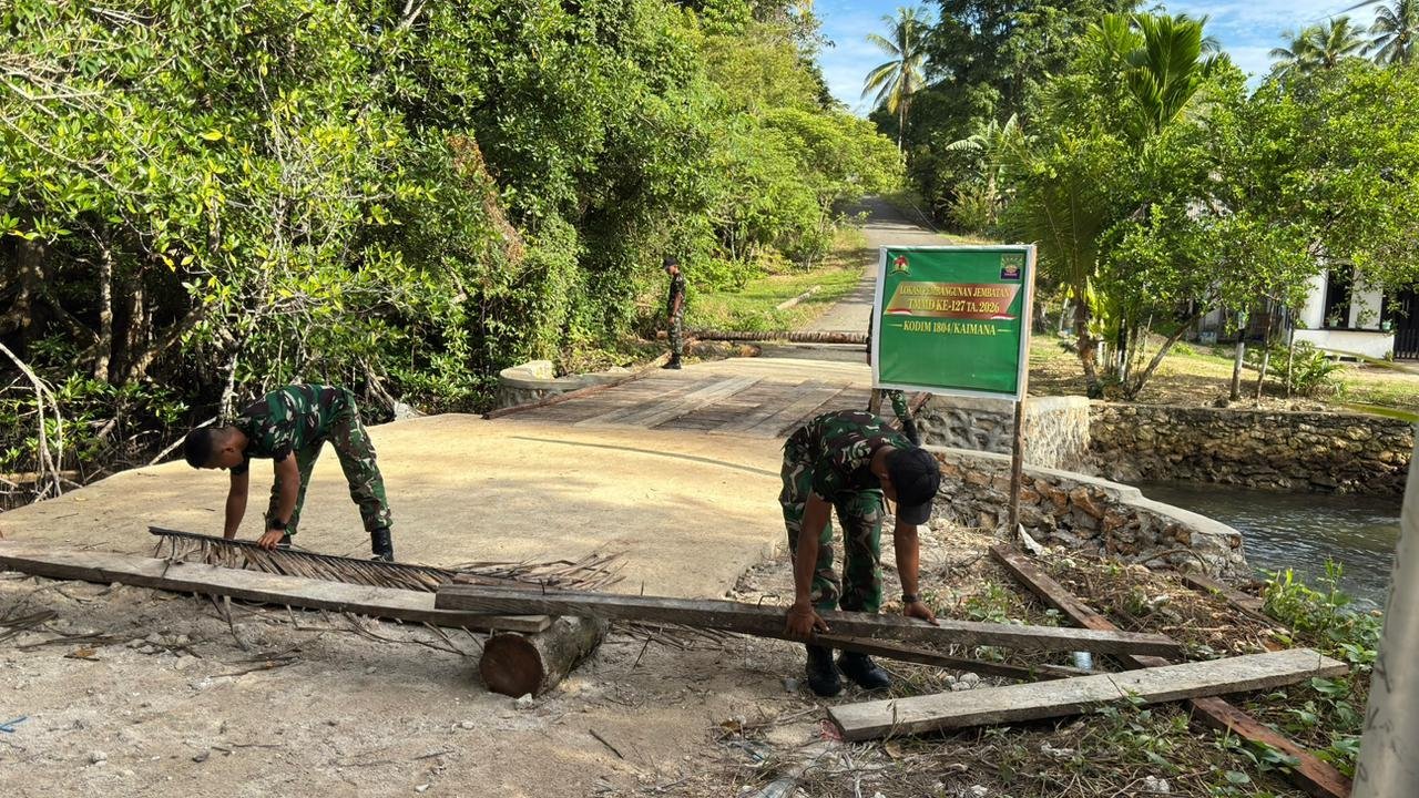 Kaimana – Menjelang rampungnya seluruh pekerjaan fisik dalam program TMMD ke-127, Satgas TMMD Kodim 1804/Kaimana melaksanakan kegiatan pembersihan pada lokasi perbaikan jembatan di Kampung Marsi, Distrik Kaimana, Kabupaten Kaimana, pada Minggu (09/03/2026).