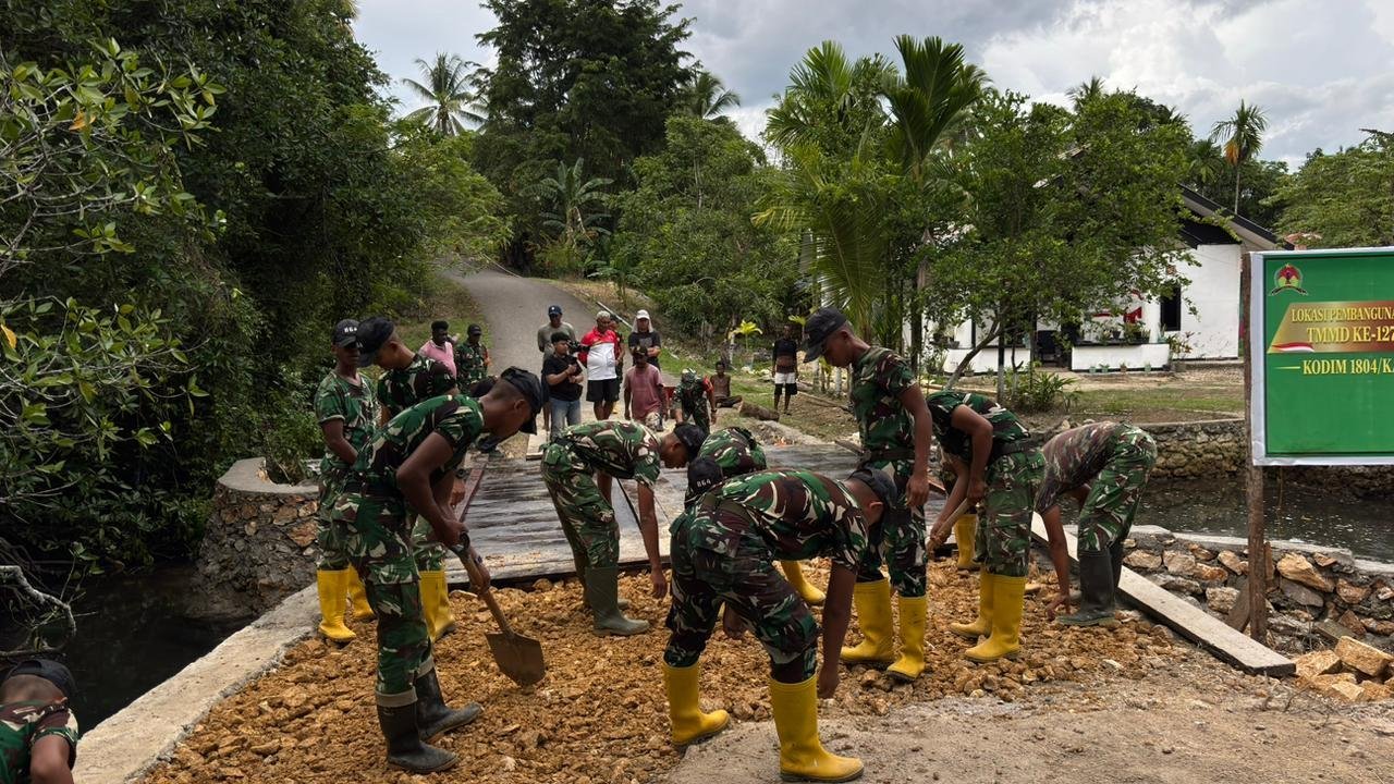 Kaimana – Personel Satgas TNI Manunggal Membangun Desa (TMMD) ke-127 dari Kodim 1804/Kaimana kembali melanjutkan pekerjaan pembangunan jembatan di Kampung Marsi, Distrik Kaimana, Kabupaten Kaimana, Jumat (06/03/2026).