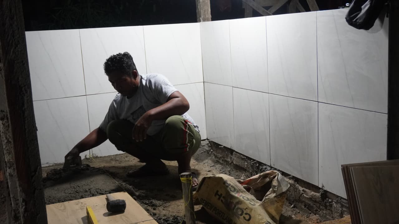 Selain pemasangan keramik, personel lainnya juga diarahkan untuk merapikan bagian dinding dengan melapisinya menggunakan acian semen agar tampilan bangunan lebih halus dan kuat.