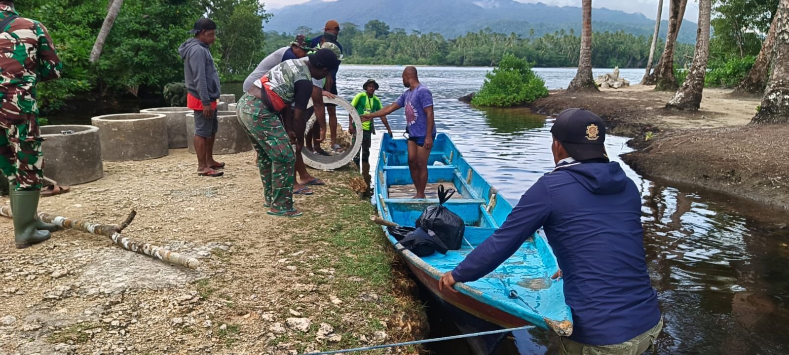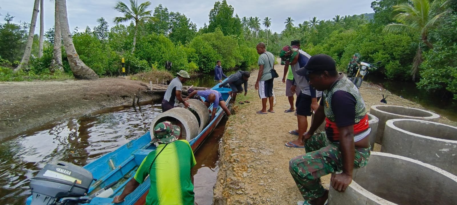 Kaimana – Semangat gotong royong kembali terlihat dalam pelaksanaan TMMD ke-127 saat personel Satgas bersama masyarakat memindahkan bahan bangunan dari perahu menuju Kampung Sisir 2, Jumat (13/02/2026).