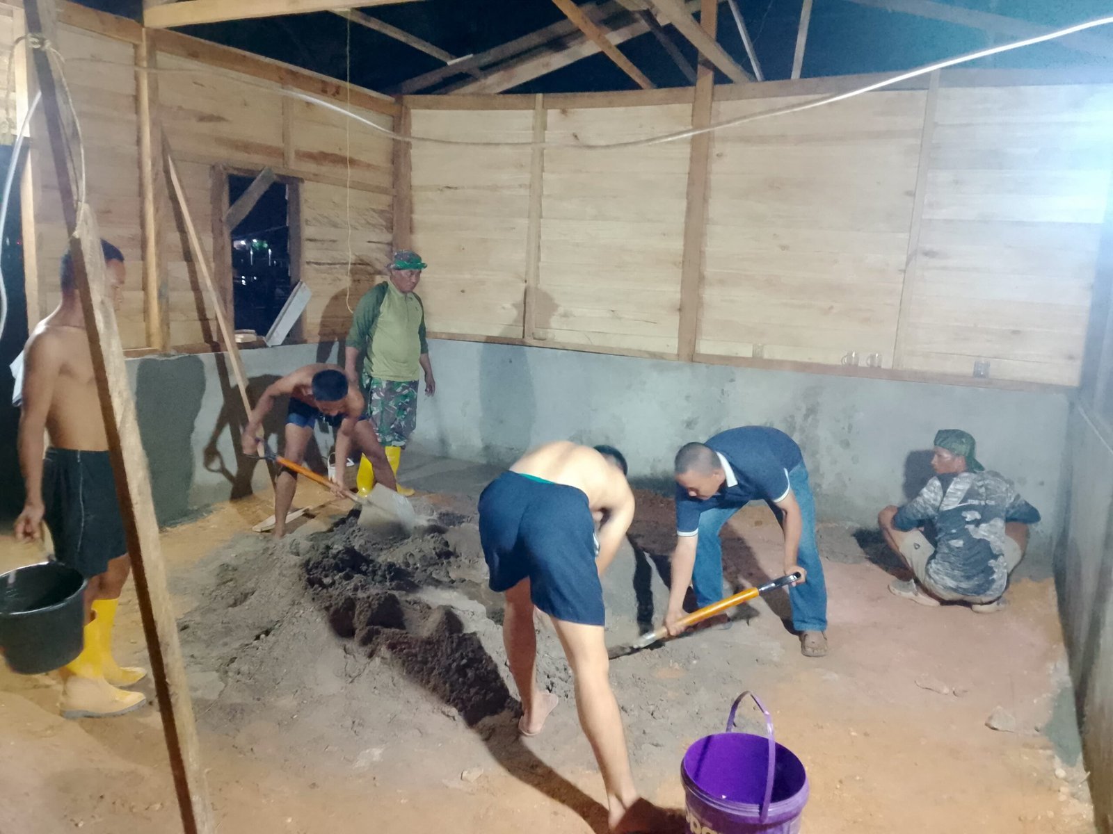 Para prajurit terlihat bahu-membahu mengerjakan berbagai tahapan pembangunan, mulai dari pemasangan rangka kayu bagian atas hingga proses perapian lantai bangunan.