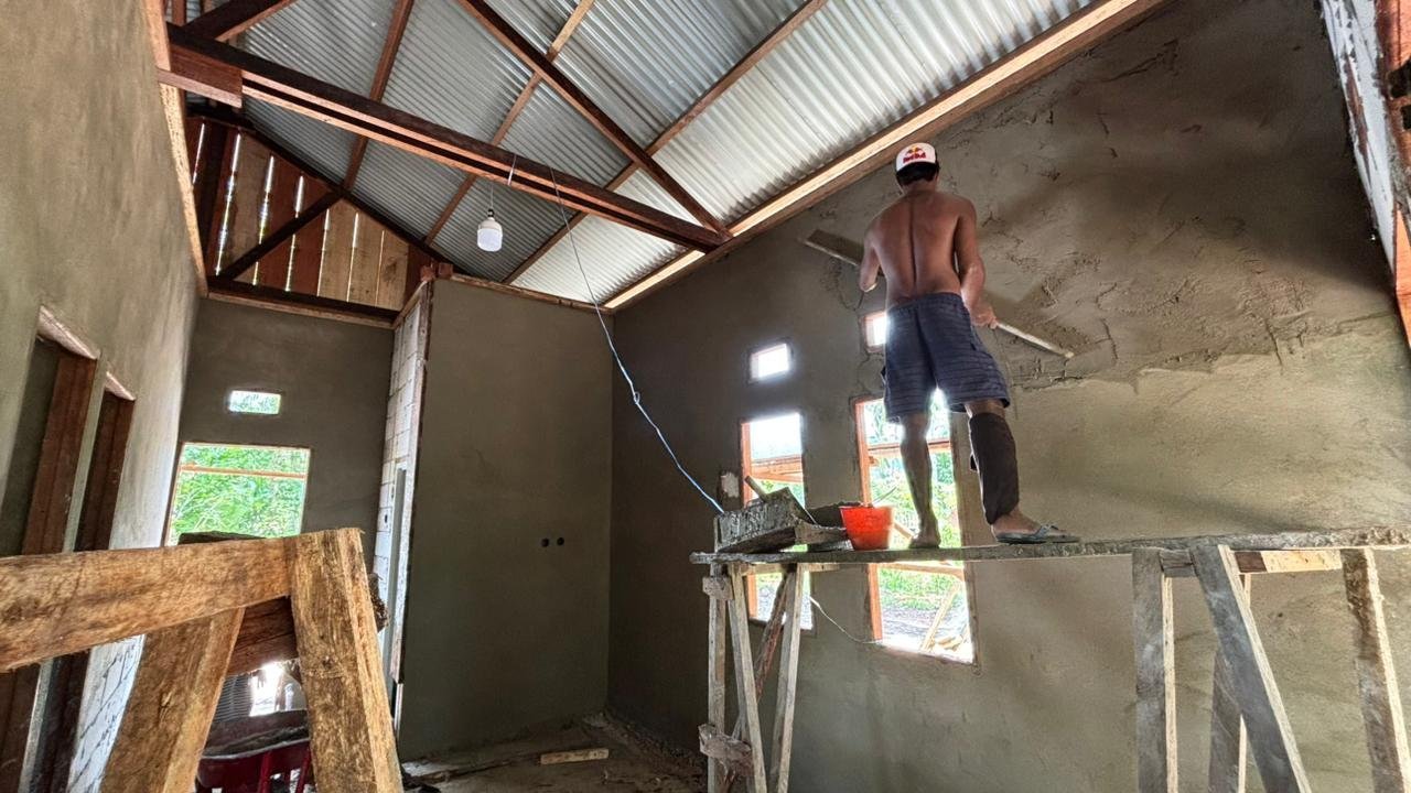 Pekerjaan plester dilakukan secara bertahap untuk memastikan bangunan menjadi lebih kokoh dan layak huni. Kehadiran Satgas di tengah masyarakat juga menjadi motivasi bagi warga untuk ikut berpartisipasi dalam pembangunan.