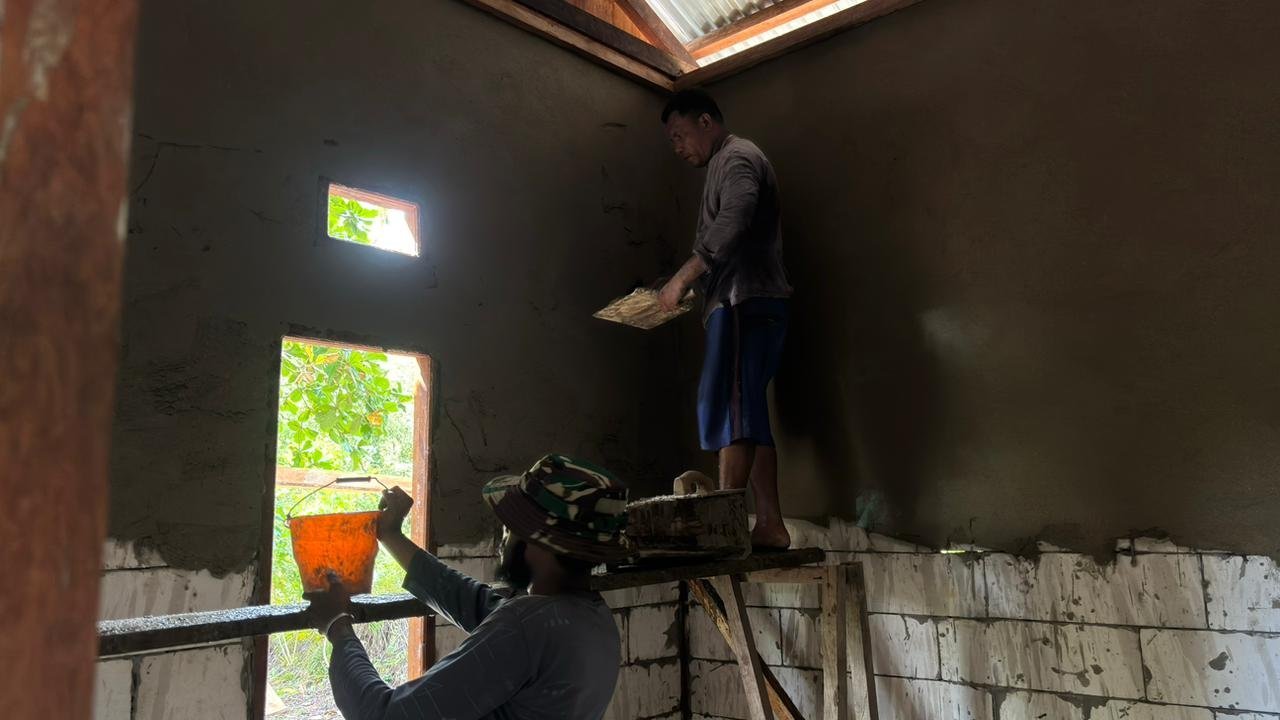Pekerjaan pemasangan plester dilakukan sebagai tahap lanjutan pembangunan rumah agar bangunan menjadi lebih kokoh dan layak huni. Personel Satgas bersama masyarakat bekerja secara bertahap dengan penuh ketelitian.