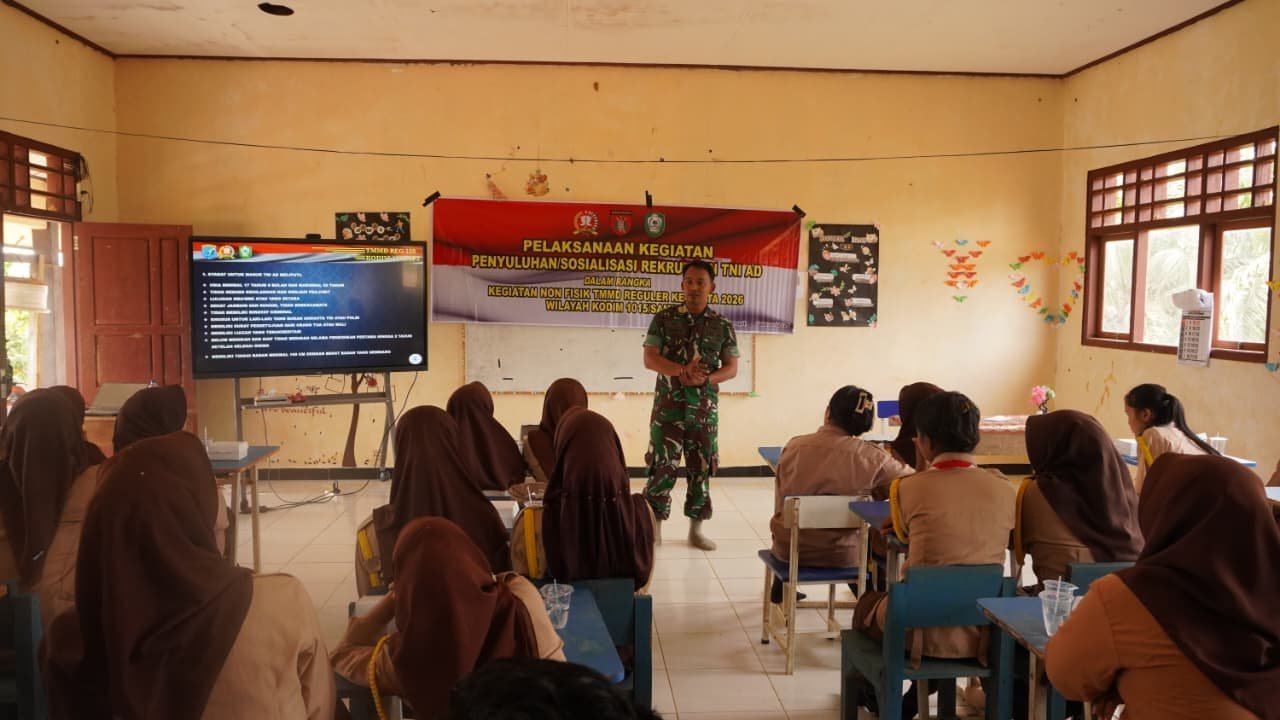 Kotawaringin Timur – Program TMMD ke-127 tidak hanya berfokus pada pembangunan infrastruktur, tetapi juga penguatan sumber daya manusia melalui kegiatan sosialisasi rekrutmen TNI AD kepada pelajar di Kecamatan Telaga Antang, Sabtu (14/02/2026).