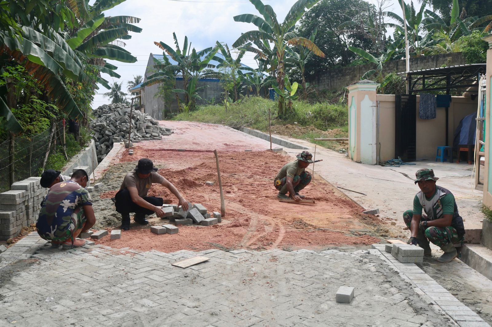 Tanpa sekat, TNI dan Polri turun langsung menyusun paving di atas hamparan pasir, memastikan setiap keping terpasang rapi dan presisi.