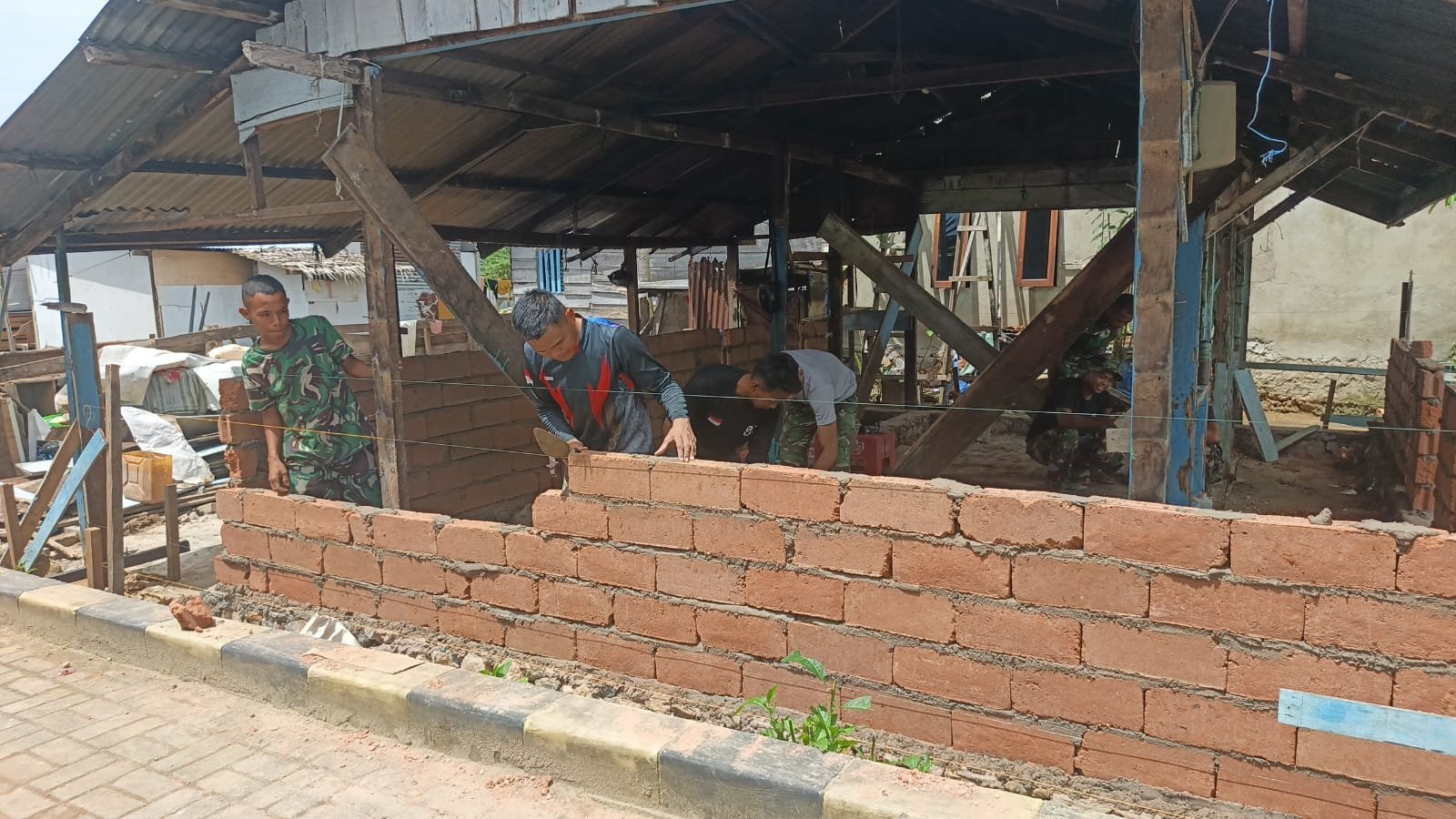 Memasuki tahap pemasangan batu bata, personel TNI terlihat bekerja dengan penuh ketelitian dan kerapian. Setiap susunan bata diperhatikan secara detail guna memastikan struktur dinding kuat, presisi, dan memiliki daya tahan jangka panjang.